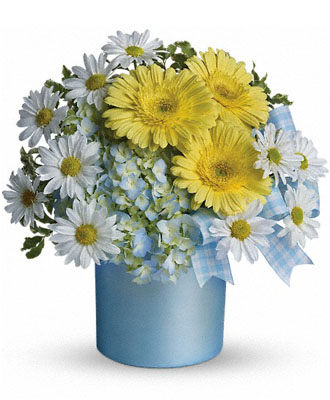 Impress your significant other with the ultimate display of affection - a breathtaking arrangement of Teleflora's Once Upon a Daisy. This stunning bouquet features a delightful combination of light blue hydrangeas, bright yellow gerberas, and delicate white daisy spray chrysanthemums that will fill any room with heartwarming emotions.